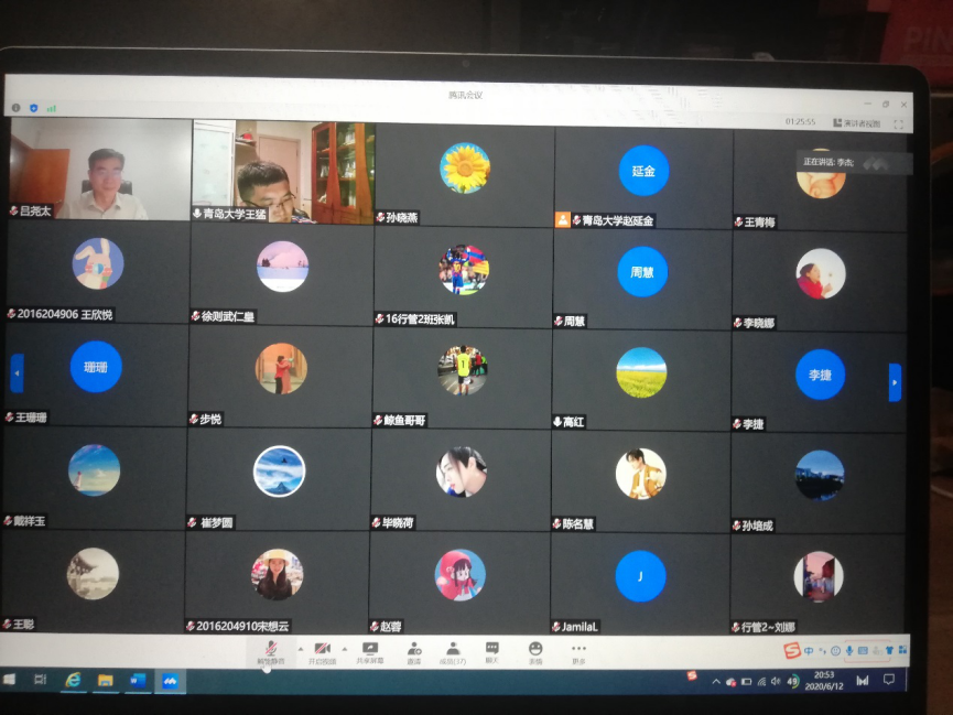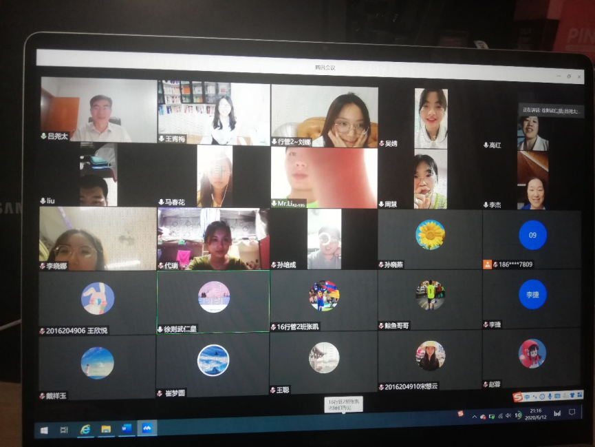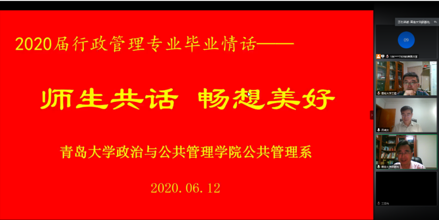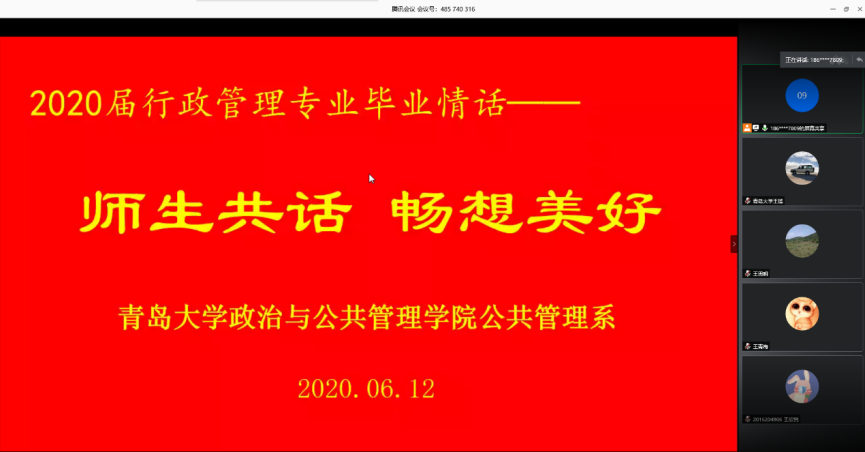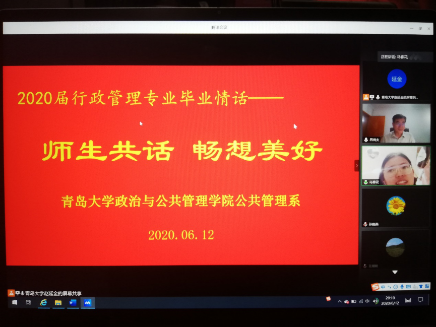 6月12日晚,球盟会公共管理系“2020届行政管理专业毕业情话——师生共话,畅想美好”活动通过网络视频会议的形式把全体教师和员工再一次联通了起来,大家纷纷通过视频共话师生情、同学情,畅想幸福未来,传递美好祝愿。